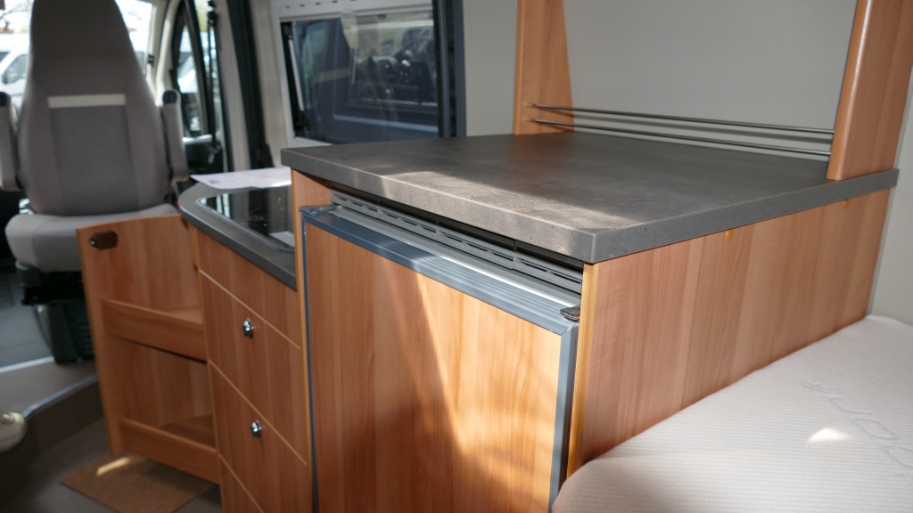 Dennoch wird das Fahrzeug nicht in der Sichtachse komplett nach hinten zugebaut, was den Innenraum groß erscheinen lässt. Die Ablagfläche oberhalb des Kühlschranks erweitert den Arbeitsbereich.